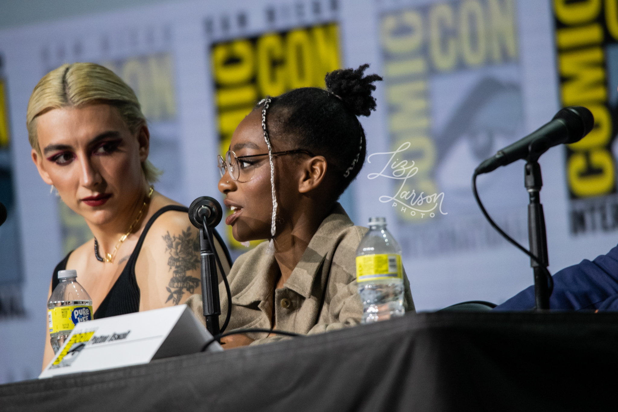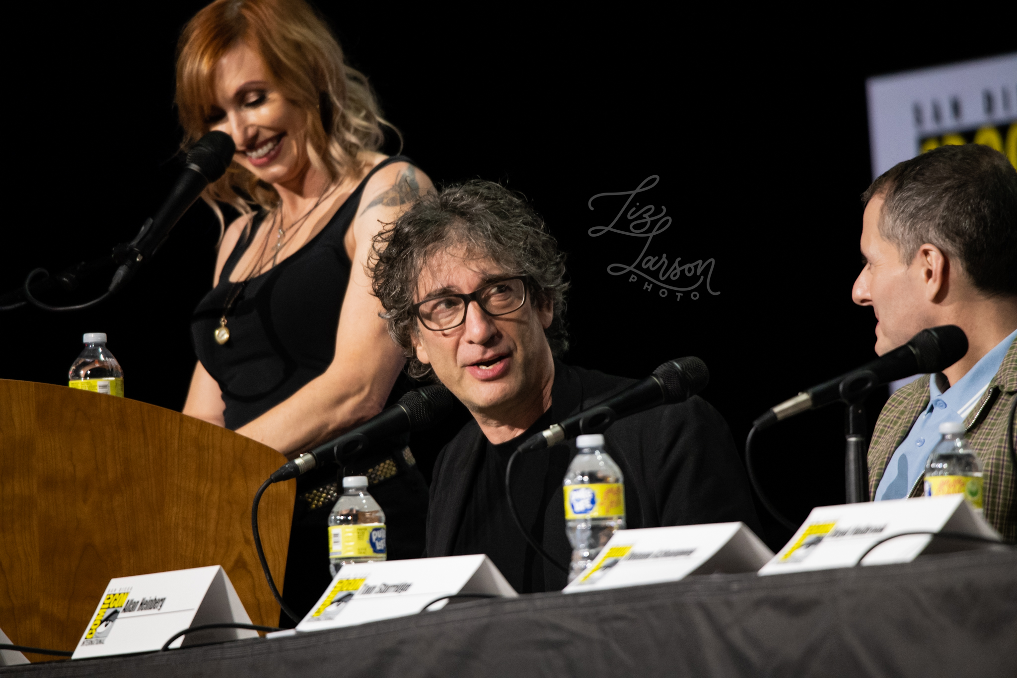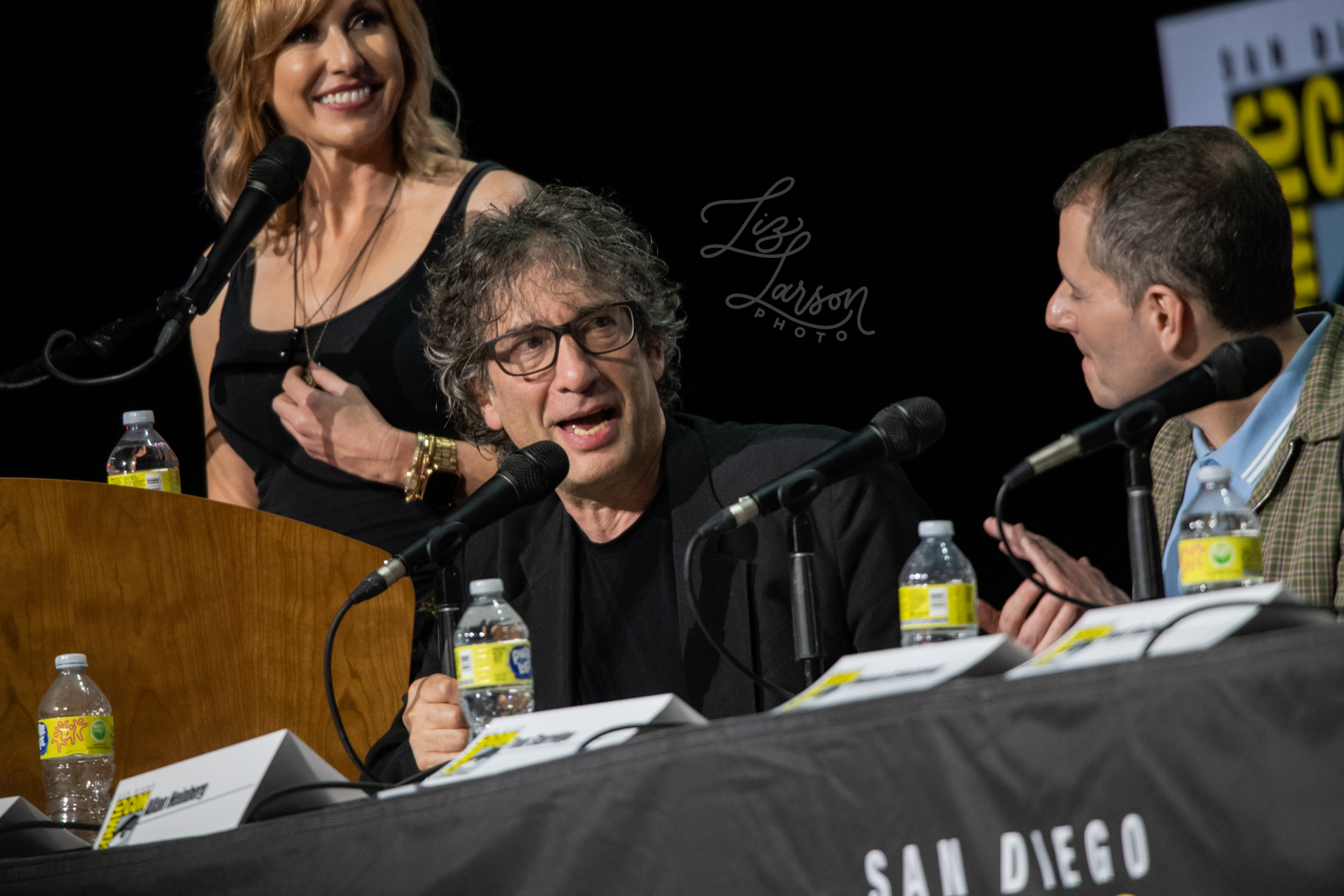 At the panel was Neil Gaiman, Tom Sturridge, Gwendoline Christie, Jenna Coleman, Boyd Holbrook, Kirby Howell-Baptiste, Mason Alexander Park, Vanesu Samunyai, Vivienne Acheampong, and Patton Oswalt.