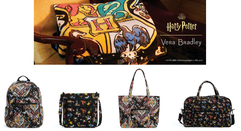 These enchanting products are available now to buy today in-store and online. This limited edition collection includes many magical styles that are sure to cast a spell on buyers. Styles like the campus backpack, weekender travel bag, and the Vera tote are standouts with beautiful patterns the Vera Bradley brand is known for. Also available is the plush throw blanket; this is the perfect companion for a Harry Potter movie marathon or to reread your favorite book.