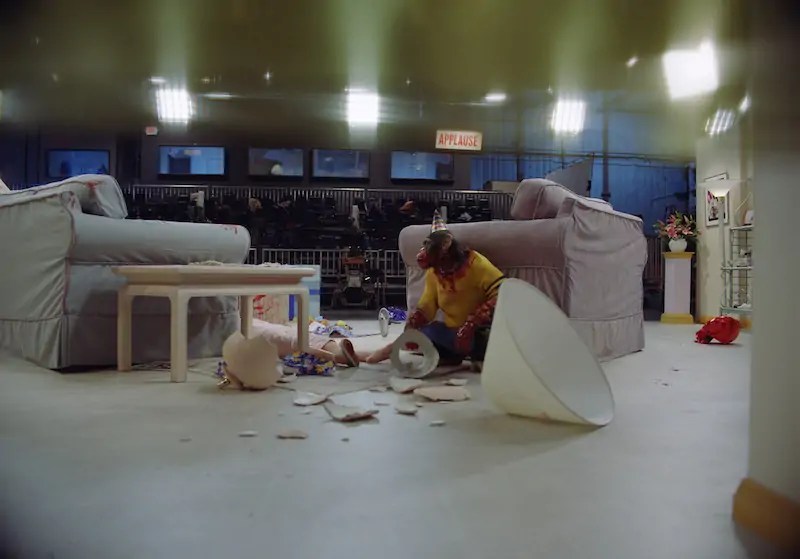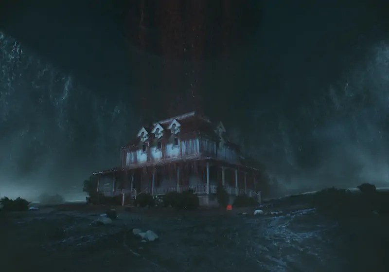 Then really where us and visual effects completed the scene was – because obviously, we put Jean Jacket over the house, and Jean Jacket is like a giant umbrella, right, and it’s raining so it’s like a giant umbrella. So we created that very strange and odd kind of circular waterfall around the house of all the water pouring down. And then obviously there’s the big wide shot where you finally see where that blood is coming from, and this is where we created that, again, you know digitally that kind of circular blood stream coming out the hole, and with the debris and the circular waterfall. So it was a big collaboration between the practical special effects and the digital visual effects to create this.