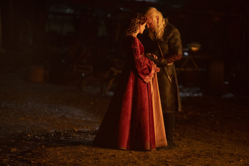 This turns the simmering tension between Rhaenyra and Viserys to a boil. She storms in and angrily confronts him in front of the entire court for pushing Jason on her. He informs her that he married for the good of the realm and that like it or not, that’s part of the princess gig. Because she’s 17 and fairly spoiled, she immediately takes off on horseback as her bodyguard Ser Criston rushes after her. When he eventually catches up to her, she opens up about her fears at being pushed out of the Iron Throne and of marriage. Criston carefully reminds her that most people would kill (and have killed) for the level of power and influence she enjoys. He’s not unsympathetic, but he pushes back at the idea that she isn’t privileged.