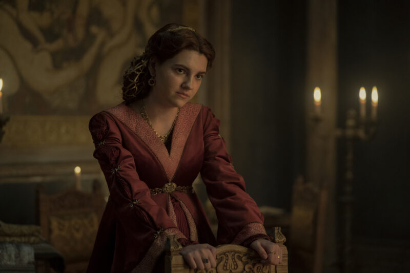 But a piece of Viserys’ mail catches her eye. It’s yet another update about the Stepstones, and it’s not looking good. Viserys complains about the predicament Daemon and Corlys have put him in. Proving that she does have influence as well as some scheming ability, Alicent sets aside the question of Aegon’s role and instead shrewdly pushes Viserys towards helping with the conflict. She’s establishing that she can be trusted to give sound advice in gentle, sweet packaging that is a direct contrast to the calculated advice he gets from his council. It works on the spineless and exhausted Viserys, who sends a fleet to the Stepstones.