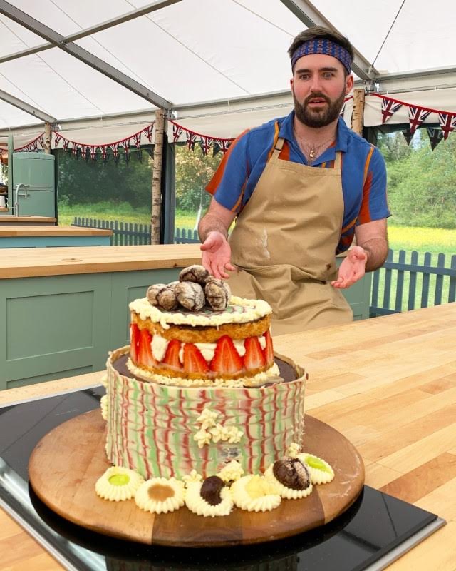 James tried to impress the judges by completing lots of elements. He made lemon and lime sponges with a vanilla soak. It was filled with dulce de leche lime curd and crème diplomat. It was then topped with chilli chocolate ganache, a feathered chocolate collar, chocolate crinkle cookies and a strawberry fraisier tart. He attempted too much and didn’t manage to perfect anything. Everything was very messy and rushed. His cake and tart were delicious, but the top sponge was a bit dry and tough. His sponges were also unevenly soaked.