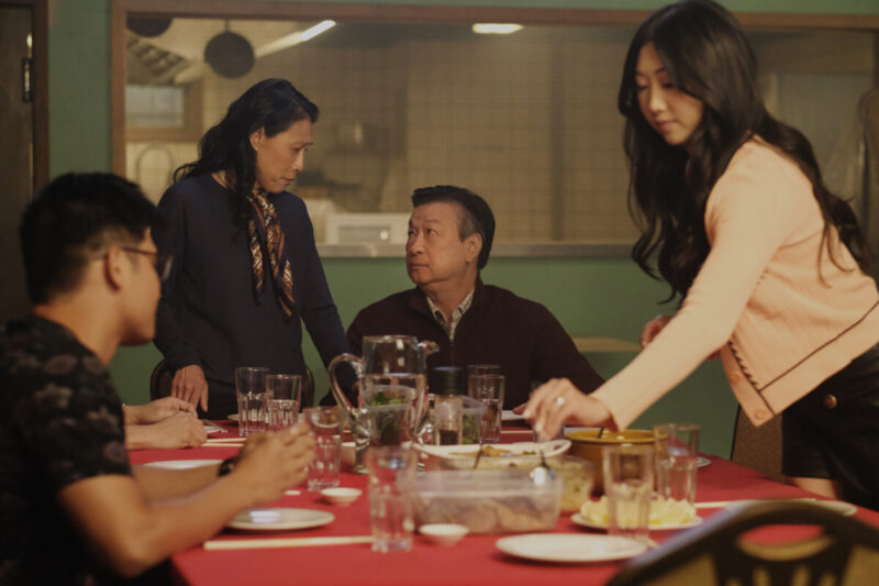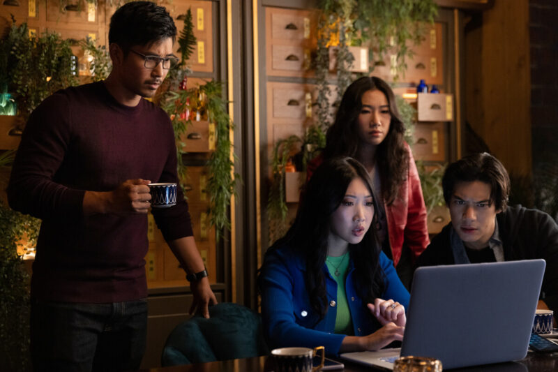 It’s family mealtime at Harmony Dumplings. Sebastian and Mei-Li seem as close as ever, with him having taken another step in integrating himself into the family by moving in with Ryan. Althea and Dennis have also moved back in with Jin and Mei-Li. Althea’s currently embroiled in a court case after turning herself in for violating her app users’ privacy to send out the earthquake alert last season. Evan and Nadya seem to be going strong as they join the Shens for dinner. Evan recently opened his own law practice. They all share a happy meal, but Nicky is notably the only single person at the table.