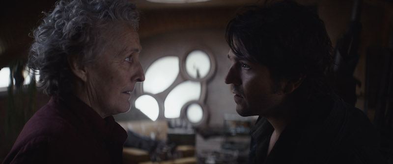 The Imperial presence on Ferrix brings up old memories for Cassian, back when he stood with his adoptive father Clem while stormtroopers marched through the streets. He remembers when they hung him in the square on Rix Road. When he returns to Maarva’s, she announces that she’s not going to leave with him; she’s staying for the Rebellion. If there are heroes brave enough to take on a whole Imperial garrison on Aldhani, she’s brave enough to stick it out there. Maarva tells him she’s never loved anything the way she loves him — but he can’t stay, and she can’t go. She also implores him to stop searching for his sister, because there were no survivors on Kenari.