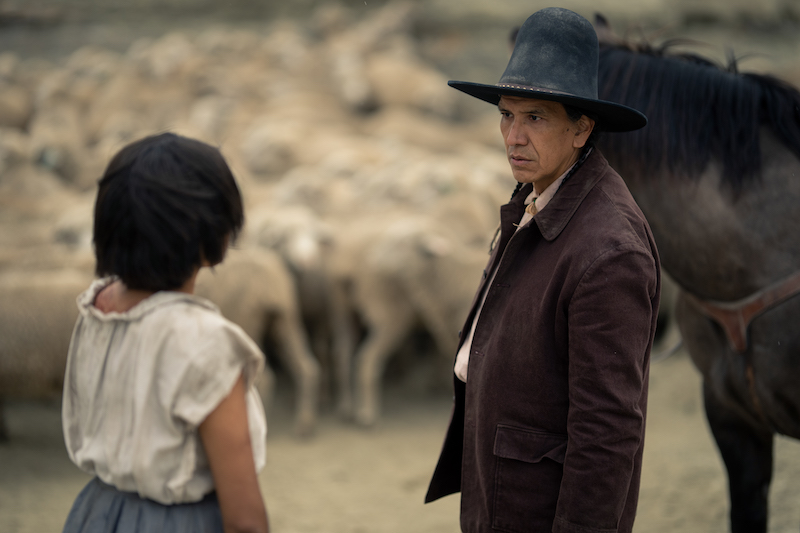 Elsewhere, we see Teonna momentarily stop to rest as she drinks from a nearly dried up stream. Later, when she stops for the night, she’s attacked by a wolf and forced to climb up onto higher ground for safety. She wakes up in the morning to find herself surrounded by a herd of sheep, and a Native American man, Hank, approaches her on horseback. When he notes that she’s a long way from the reservation, she admits that she ran away from the Indian school. When she tells him what she did to the nuns, Hank fiercely tells her that they had it coming. He offers to bring her home with him, and he’ll get word to her father.