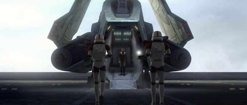 Meanwhile, Hemlock arrives on Eriadu and is escorted to a meeting with Tarkin and several Imperial officers. Tarkin remarks he is late, and Hemlock says he needed to attend to a few matters. On the Marauder, Tech tells the clones he found a suitable place to land, and Echo adds he acquired a clearance code from a contact. They are cleared to approach the planet under the code Vessel 1143.