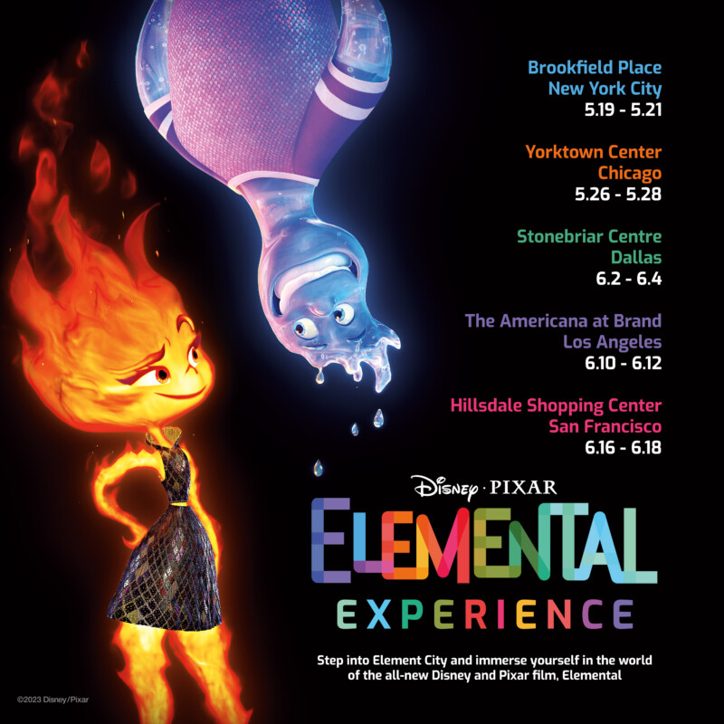 Disney and Pixar have also announced an exciting multi-city mall tour that invites fans into the world of Elemental — a stunning locale only Pixar artists could create — which kicks off this Friday, May 19, in New York City’s Brookfield Place through May 21. Disney and Pixar’s Elemental Experience, which hits Chicago (May 26-28), Dallas (June 2-4), Los Angeles (June 10-12), and San Francisco (June 16-18), offers an immersive thematic environment for visitors of all ages. Sponsored by Fandango, Dolby, and I’m the Chef Too, the tour features fun film-themed activities like photo and video opportunities, a chance to draw with Pixar artists, a movie-ticket grab in a wind tunnel, plus giveaways and special film content.