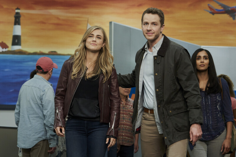 At baggage claim, a young Olive tells TJ she read two chapters of A Wrinkle in Time already, and TJ tells her to enjoy. Olive walks away, happy that he remembered her name. TJ and Violet get reacquainted with each other as they both grabbed their suitcases. Michaela goes over to Jared, who is happily waiting for her. He tells her that the trip gave him time to think and thinks he proposed too soon after the accident. He wants to be her husband, and he wants her to say yes without hesitation because she’s crazy in love with him. Michaela tells Jared she will always love him, and the trip made her realize that they want different things. She doesn’t want to change, and she doesn’t want him to change. She thinks there’s someone better out there for him and someone that wants everything he wants. Michaela gives Jared the ring back, telling him they will find a way to each other. Jared wonders how she can be so sure, and she tells him he has to have hope. The two of them hug. Alex waves over Saanvi, who is surprised to see her. She says not getting on the flight to Jamaica was the biggest mistake she made. She wants to be with her and start a family with her if she can forgive her. Saanvi immediately kisses her.