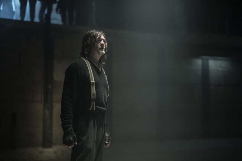 After being put inside of a fighting pit by Genet, Daryl must fight to protect himself from dying and becoming a burner. Dr. LaFleur sends in the first walker that Daryl defeats rather quickly. After that Genet asks if that’s the best he’s got — but that was just the first. Dr. LaFleur sends in four more burners one of which explodes and two of the others go after each leaving two left. Quinn and Daryl are chained to each other with just a pipe and a axe between them to take down the two walkers which they do. Genet orders her men to kill Daryl and Quinn but Fallou shoots down one of them causing panic to erupt so that Daryl and Quinn can escape. As they make their way through the building, Daryl notices Quinn has a burn on his back but he reassures Daryl he can’t feel it. Once they get to a semi-safe location it all starts catching up to Quinn and Daryl attempts to free himself from the chain.