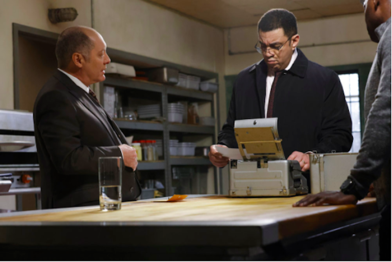 At Paula’s, Paula treats Dembe and Reddington to some treats, when Reddington tells Paula that she knows who they are. Paula apologizes, and when Reddington asks how she found out, she pulls out a manuscript/memoir of sorts that she found under Glen’s bed. Paula tells Red that she’s fallen on some hard times financially and asks if Red will lend her some money, which she insists on paying back. Red tells her it’s a gift, but she says she could press his suit or make him and Dembe meals. To please her, he says for her to think of it as purchasing Glen’s manuscript and for her continued discretion. Paula also told Red that she picked up a job at a cellular company, and Red may require her services.