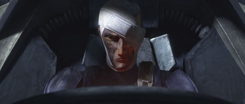 On Cad Bane’s ship, Omega is sleeping handcuffed in a cell. She wakes up and examines her cell. She asks Todo 360 to release which he refuses. He informs her that her comm device has been confiscated. She tries to convince her to set her free without success. Todo advises her to be more cooperative because Bane doesn’t like difficult prisoners. Cad Bane arrives and introduces himself to Omega who informs him that he will be sorry when her friends arrive. He answers that he made sure nobody will come to help her and leave her in the cell.